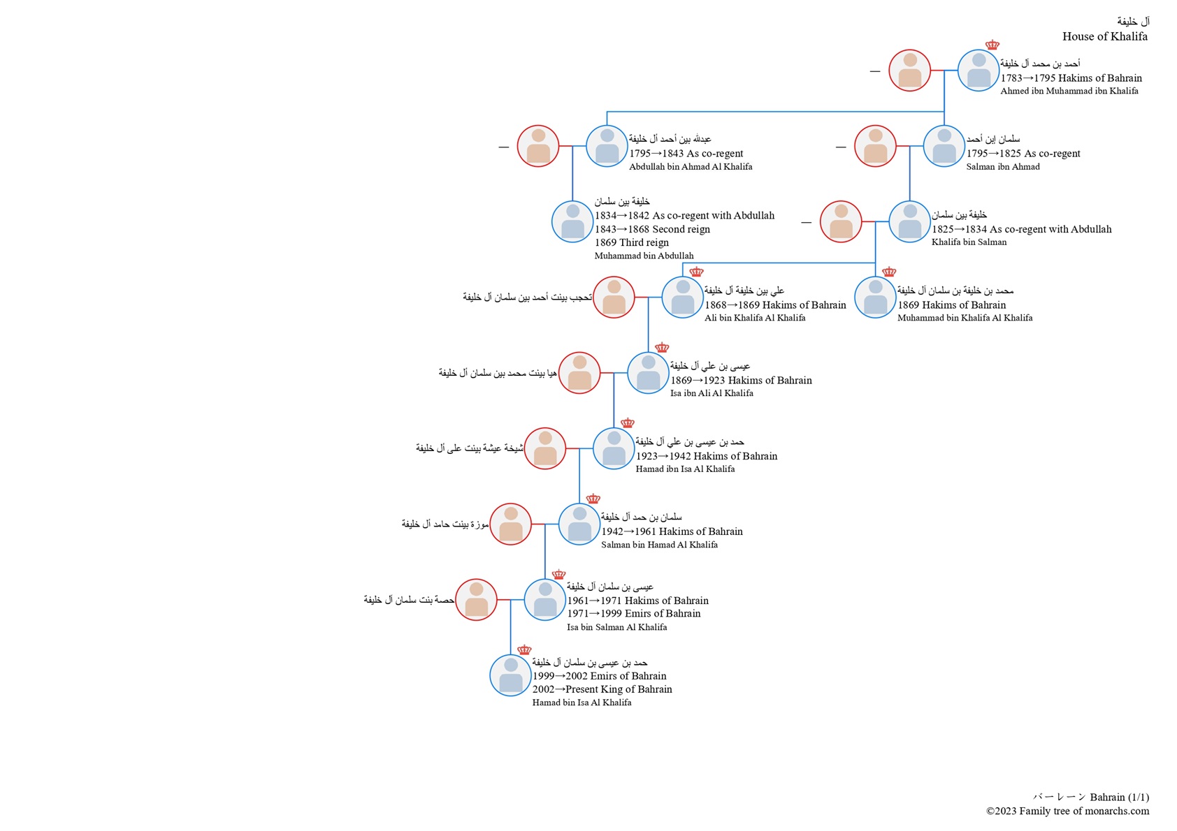 バーレーン王室の家系図 更新日:2026-02-06 公開日:2026-01-23 家系図 注:図中の言語はアラビア語です。 関連記事 日本の皇室の家系図ベルギー王室の家系図スペイン王室の家系図リヒテンシュタイン王室の家系図イギリス王室の家系図モナコ王室の家系図 投稿ナビゲーション タイ王室の家系図オランダ王室の家系図