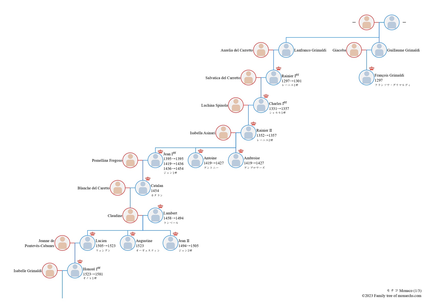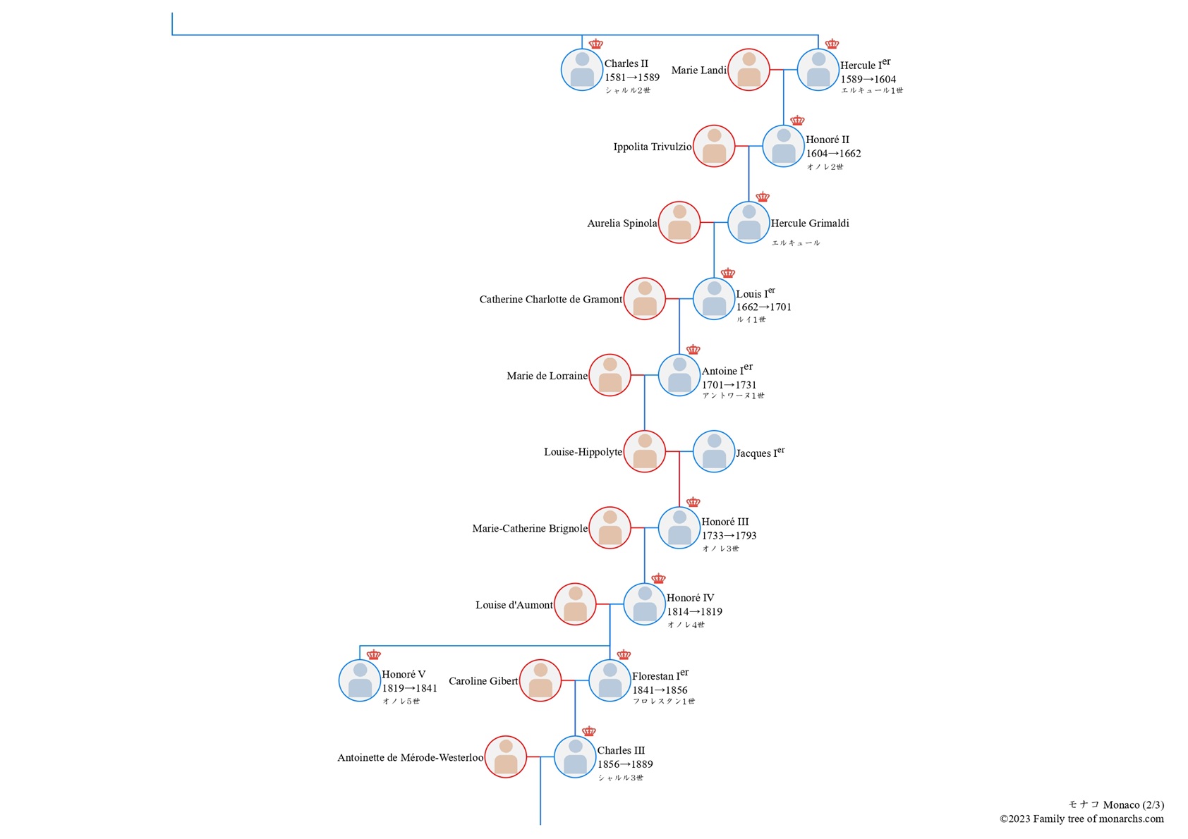モナコ王室の家系図 更新日:2026-02-06 公開日:2026-01-22 家系図 注:図中の言語はフランス語です。 関連記事 オランダ王室の家系図ルクセンブルク王室の家系図ベルギー王室の家系図ブルネイ王室の家系図イギリス王室の家系図スペイン王室の家系図 投稿ナビゲーション スウェーデン王室の家系図リヒテンシュタイン王室の家系図